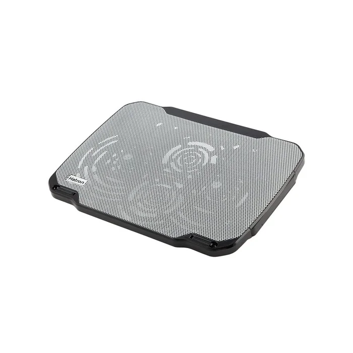 پایه خنک کننده لپ تاپ هترون Hatron HCP080 به دو فن خنککننده مجهز شده که به شکلی بهینه در زیر سطح فلزی قرار گرفتهاند. این دو فن جریان باد یکنواختی ایجاد میکنند و باعث میشوند گرمای لپتاپ بهصورت مداوم و مؤثر دفع شود.
