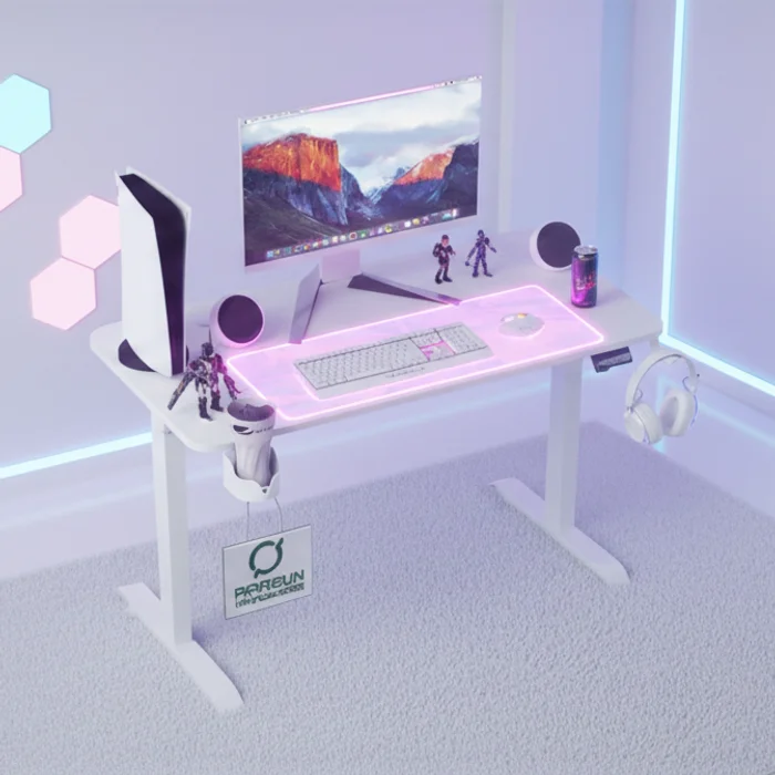 ویژگی خاص و متفاوت این مدل، قابلیت تنظیم ارتفاع از ۷۲ تا ۱۱۷ سانتیمتره. یعنی میتونی کاملاً بسته به حالت نشستن یا ایستادن خودت میز رو تنظیم کنی. اگه عادت داری مدت طولانی پای بازی یا کار بشینی، این قابلیت کمک میکنه بدن خسته نشه و راحتتر بتونی تمرکز کنی. فقط یه دکمه تنظیم لازم داره تا میز دقیقاً بر اساس قد و موقعیت بدن تنظیم بشه.